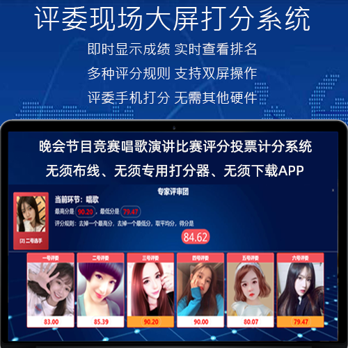 本系统是一款专业的经济实用的可多屏导播的评委现场打分投票Web系统,现场架设方便快捷,适合于有外网访问条件,现场评委配有智能设备(手机、平板)的打分投票场合。无需安装、无需购买专用打分器硬件,专家评委和大众评委(可选)用手机或平板扫码就可评分或投票。打分过程和成绩计算过程大屏上即时显示,公开透明。后台评分面板控制打分节奏,成绩实时计算保存,并可导出。